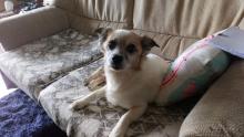 Nos dio tanta pena la historia que no pudimos dejarlos allí. Nada más salir del centro cambiaron 100%, son unos perros súper cariñosos y alegres. Pesa unos 6 kilos.
