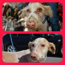 Nos dieron aviso de una perrita en muy malas condiciones. Nos encontramos a una pequeña "maraña" de nudos donde era imposible distinguir apenas su cuerpo. No conocemos nada de su historia pero de la manera que tenía su pelo, dudamos que lleve poco abandonada.