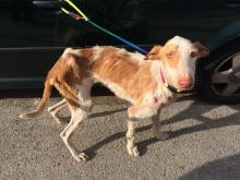 Recibimos un aviso de un podenco famélico, debido a su extrema delgadez, no podía ni levantarse. No dudamos en ir a por él.