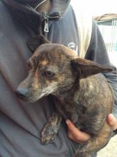 CRIS - HIJO DE MADAME. Recibimos un aviso de una perrita que corría gran riesgo de ser atropellada. Fuimos en su busca y la encontramos cruzando la carretera, tenia mucho miedo y al intentar acercarnos salía corriendo. La seguimos por descampados entre basura y chabolas. Nos llevó hasta una casa abandonada llena de escombros, basura, preservativos, agujas, heces y ratas. Allí estaban ellos, 6 preciosos cachorritos llenos de pulgas hasta los ojos. Su madre se escondió al vernos llegar, asustada, gruñía en una esquina intentando proteger a sus pequeños.