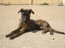 Yelco es un cruce de mastín con galgo muy tranquilo, se lleva bien con perros, con gatos y fantástico con niños.