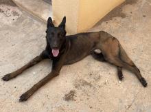 La compañera recibía una llamada de los vecinos: un almacén de verduras, donde se habia colado un precioso malinois, caquexico y deshidratado. Le ofrecieron agua la cual bebió con muchísima ansia.