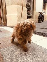 Es un macho joven, con claros indicios de haber sido maltratado. Si se habla en un tono elevado o se mueven los brazos por encima de los hombros, se tira al suelo temblando.