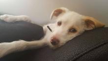 Por suerte no tiene nada roto. Es un perro muy cariñoso y sociable, solo pide mimos y como cachorro que es, pasa el dia jugando.