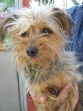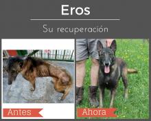 Dero estaba abandonado en un pueblo de Almería, en este estado: casi ciego y con claros signos de Leishmania. Pese a que las adopciones de ppp son casi nulas y viven con nosotros durante años, no podíamos dejarle allí.