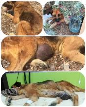 ABUELA TIRADA EN UNA RAMBLA SIN PODER MOVERSE , LLENA DE TUMORES , CON UNA PATA FRACTURADA , PIOMETRA Y FAMÉLICA.
